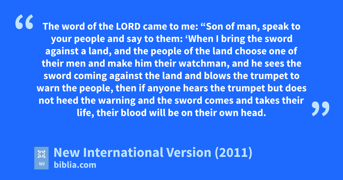33 The word of the Lord came to me: 2 “Son of man, speak to your people and say to them: ‘When I bring the swordo against a land, and the people of the land choose one of their men and make him their watchman,p 3 and he sees the sword coming against the land and blows the trumpetq to warn the people, 4 then if anyone hears the trumpet but does not heed the warningr and the sword comes and takes their life, their blood will be on their own head.s 5 Since they heard the sound of the trumpet but did not heed the warning, their blood will be on their own head.t If they had heeded the warning, they would have saved themselves.u 6 But if the watchman sees the sword coming and does not blow the trumpet to warn the people and the sword comes and takes someone’s life, that person’s life will be taken because of their sin, but I will hold the watchman accountable for their blood.’v