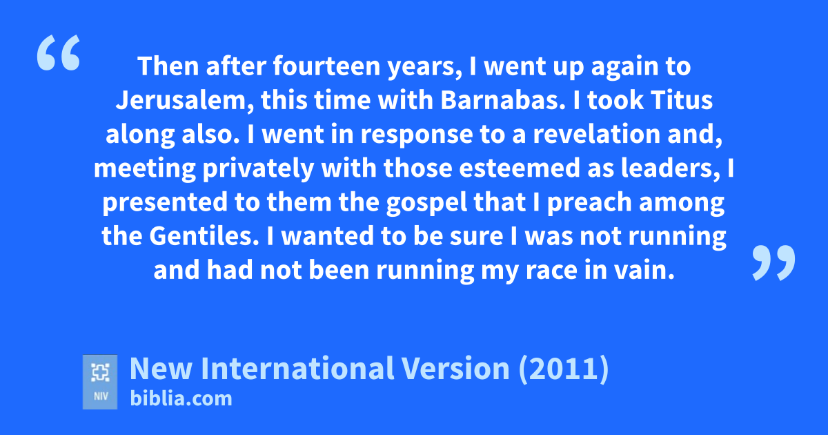 2 Then after fourteen years, I went up again to Jerusalem,v this time with Barnabas.w I took Titusx along also. 2 I went in response to a revelationy and, meeting privately with those esteemed as leaders, I presented to them the gospel that I preach among the Gentiles.z I wanted to be sure I was not running and had not been running my racea in vain. 3 Yet not even Titus,b who was with me, was compelled to be circumcised, even though he was a Greek.c 4 This matter arose because some false believersd had infiltrated our ranks to spy one the freedomf we have in Christ Jesus and to make us slaves. 5 We did not give in to them for a moment, so that the truth of the gospelg might be preserved for you.