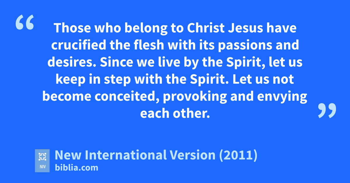 22 But the fruitu of the Spirit is love,v joy, peace,w forbearance, kindness, goodness, faithfulness, 23 gentleness and self-control.x Against such things there is no law.y 24 Those who belong to Christ Jesus have crucified the fleshz with its passions and desires.a 25 Since we live by the Spirit,b let us keep in step with the Spirit. 26 Let us not become conceited,c provoking and envying each other.