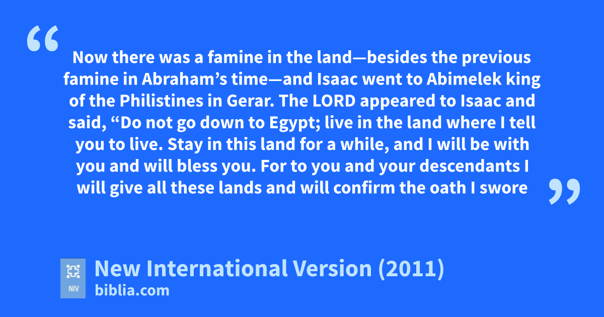 26 Now there was a famine in the lands—besides the previous famine in Abraham’s time—and Isaac went to Abimelek king of the Philistinest in Gerar.u 2 The Lord appearedv to Isaac and said, “Do not go down to Egypt;w live in the land where I tell you to live.x 3 Stay in this land for a while,y and I will be with youz and will bless you.a For to you and your descendants I will give all these landsb and will confirm the oath I swore to your father Abraham.c 4 I will make your descendantsd as numerous as the stars in the skye and will give them all these lands,f and through your offspringa all nations on earth will be blessed,b g 5 because Abraham obeyed meh and did everything I required of him, keeping my commands, my decreesi and my instructions.j” 6 So Isaac stayed in Gerar.k