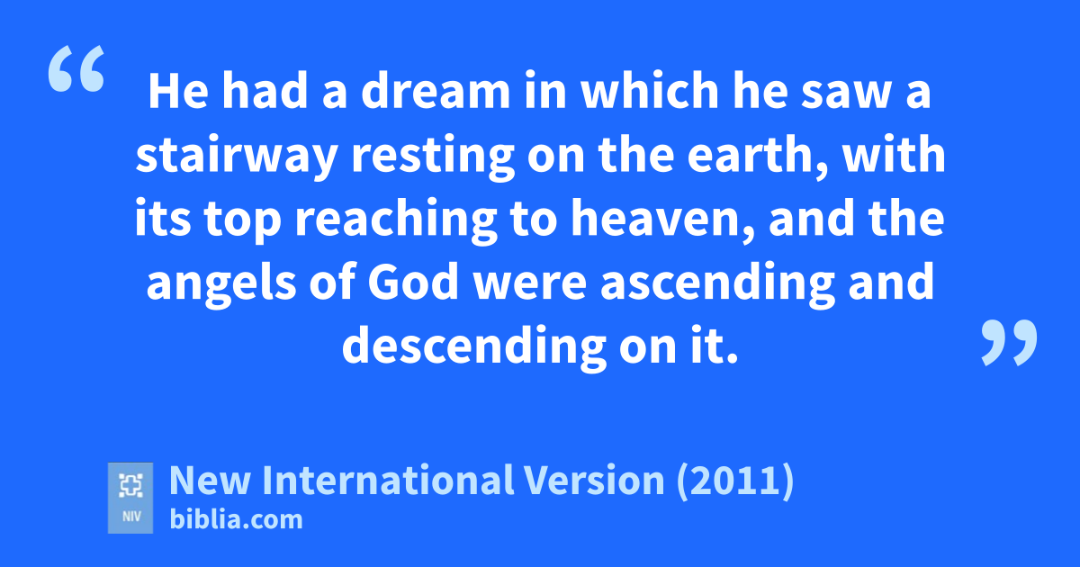 10 Jacob left Beershebad and set out for Harran.e 11 When he reached a certain place,f he stopped for the night because the sun had set. Taking one of the stones there, he put it under his headg and lay down to sleep. 12 He had a dreamh in which he saw a stairway resting on the earth, with its top reaching to heaven, and the angels of God were ascending and descending on it.i 13 There above itc stood the Lord,j and he said: “I am the Lord, the God of your father Abraham and the God of Isaac.k I will give you and your descendants the landl on which you are lying.m 14 Your descendants will be like the dust of the earth, and youn will spread out to the west and to the east, to the north and to the south.o All peoples on earth will be blessed through you and your offspring.d p 15 I am with youq and will watch over your wherever you go,s and I will bring you back to this land.t I will not leave youu until I have done what I have promised you.v”w