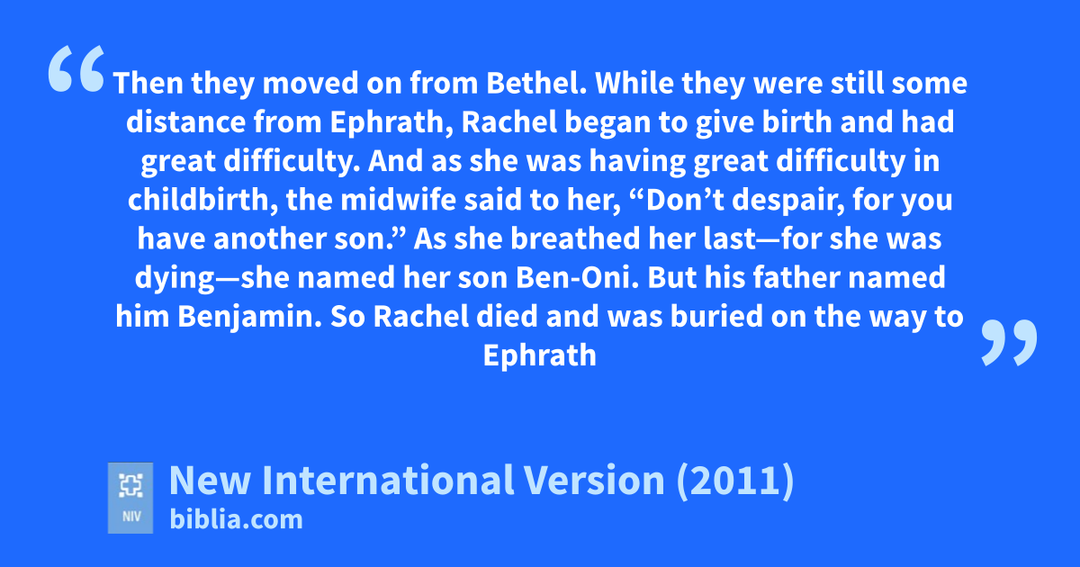 16 Then they moved on from Bethel. While they were still some distance from Ephrath,b Rachelc began to give birth and had great difficulty. 17 And as she was having great difficulty in childbirth, the midwifed said to her, “Don’t despair, for you have another son.”e 18 As she breathed her last—for she was dying—she named her son Ben-Oni.h f But his father named him Benjamin.i g