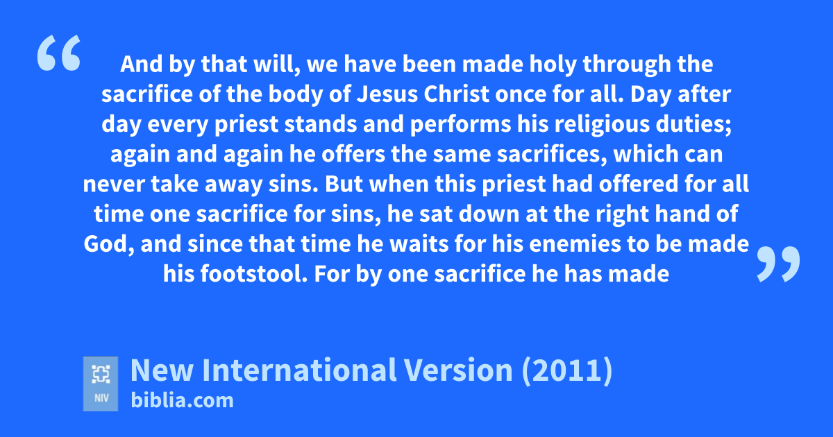 11 Day after day every priest stands and performs his religious duties; again and again he offers the same sacrifices,f which can never take away sins.g 12 But when this priest had offered for all time one sacrifice for sins,h he sat down at the right hand of God,i 13 and since that time he waits for his enemies to be made his footstool.j 14 For by one sacrifice he has made perfectk forever those who are being made holy.l
