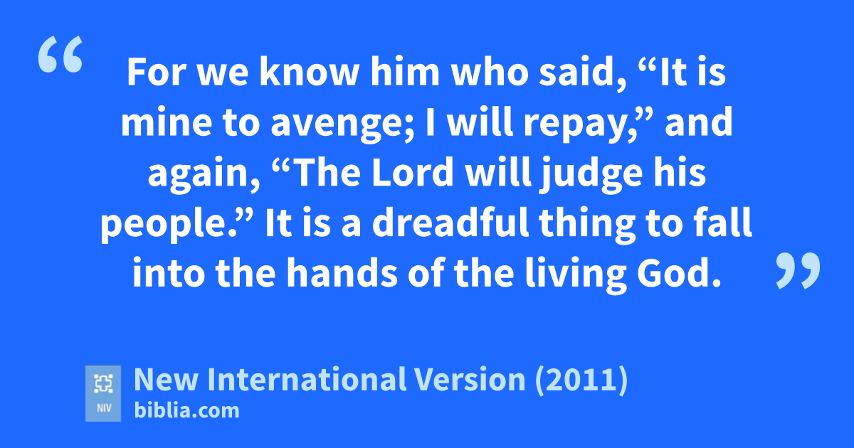 26 If we deliberately keep on sinningg after we have received the knowledge of the truth,h no sacrifice for sins is left, 27 but only a fearful expectation of judgment and of raging firei that will consume the enemies of God. 28 Anyone who rejected the law of Moses died without mercy on the testimony of two or three witnesses.j 29 How much more severely do you think someone deserves to be punished who has trampled the Son of Godk underfoot,l who has treated as an unholy thing the blood of the covenantm that sanctified them,n and who has insulted the Spirito of grace?p 30 For we know him who said, “It is mine to avenge; I will repay,”d q and again, “The Lord will judge his people.”e r 31 It is a dreadful things to fall into the handst of the living God.u