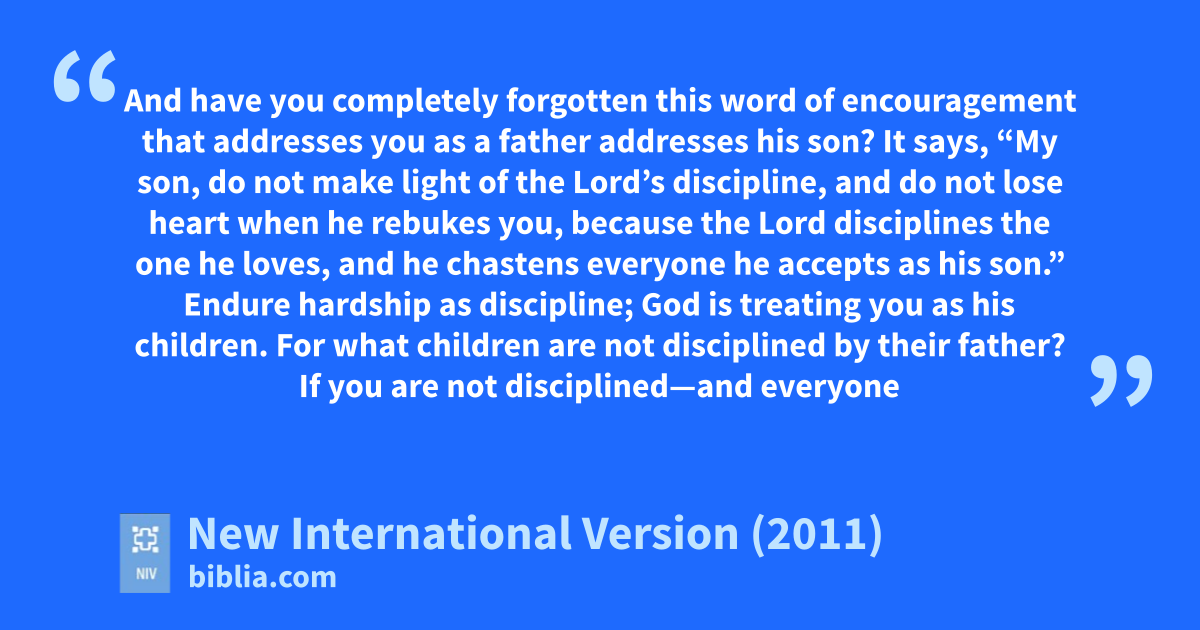 7 Endure hardship as discipline; God is treating you as his children.s For what children are not disciplined by their father? 8 If you are not disciplined—and everyone undergoes disciplinet—then you are not legitimate, not true sons and daughters at all. 9 Moreover, we have all had human fathers who disciplined us and we respected them for it. How much more should we submit to the Father of spiritsu and live!v 10 They disciplined us for a little while as they thought best; but God disciplines us for our good, in order that we may share in his holiness.w 11 No discipline seems pleasant at the time, but painful. Later on, however, it produces a harvest of righteousness and peacex for those who have been trained by it.