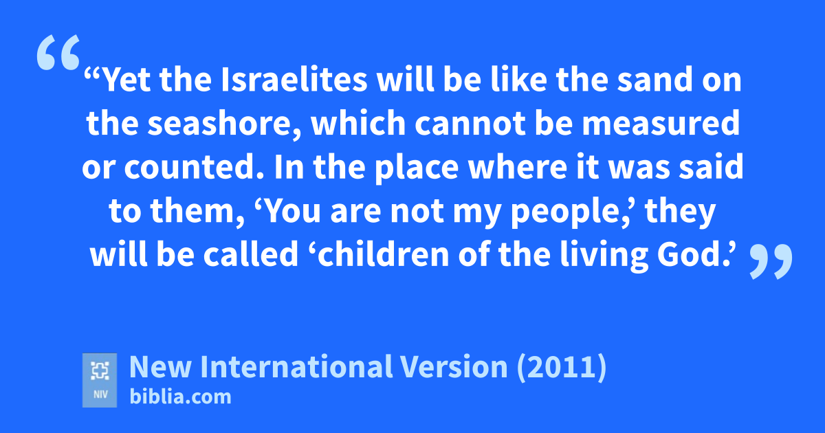 10 “Yet the Israelites will be like the sand on the seashore, which cannot be measured or counted.u In the place where it was said to them, ‘You are not my people,’ they will be called ‘children of the living God.’v 11 The people of Judah and the people of Israel will come together;w they will appoint one leaderx and will come up out of the land,y for great will be the day of Jezreel.c z