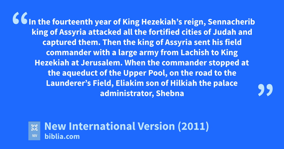 36 In the fourteenth year of King Hezekiah’st reign, Sennacheribu king of Assyria attacked all the fortified cities of Judah and captured them.v 2 Then the king of Assyria sent his field commander with a large army from Lachishw to King Hezekiah at Jerusalem. When the commander stopped at the aqueduct of the Upper Pool, on the road to the Launderer’s Field,x 3 Eliakimy son of Hilkiah the palace administrator,z Shebnaa the secretary,b and Joahc son of Asaph the recorderd went out to him.