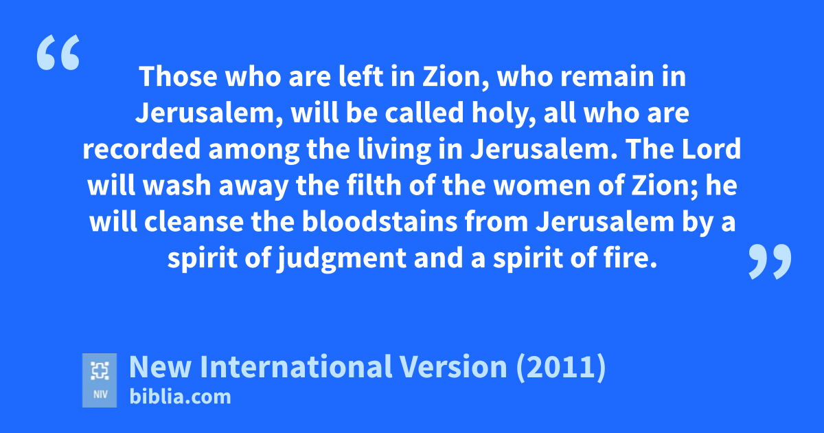 2 In that dayt the Branch of the Lordu will be beautifulv and glorious, and the fruitw of the land will be the pride and gloryx of the survivorsy in Israel. 3 Those who are left in Zion,z who remaina in Jerusalem, will be called holy,b all who are recordedc among the living in Jerusalem. 4 The Lord will wash away the filthd of the women of Zion;e he will cleansef the bloodstainsg from Jerusalem by a spirita of judgmenth and a spiritb of fire.i 5 Then the Lord will createj over all of Mount Zionk and over those who assemble there a cloud of smoke by day and a glow of flaming fire by night;l over everything the gloryc m will be a canopy.n 6 It will be a sheltero and shade from the heat of the day, and a refugep and hiding place from the stormq and rain.