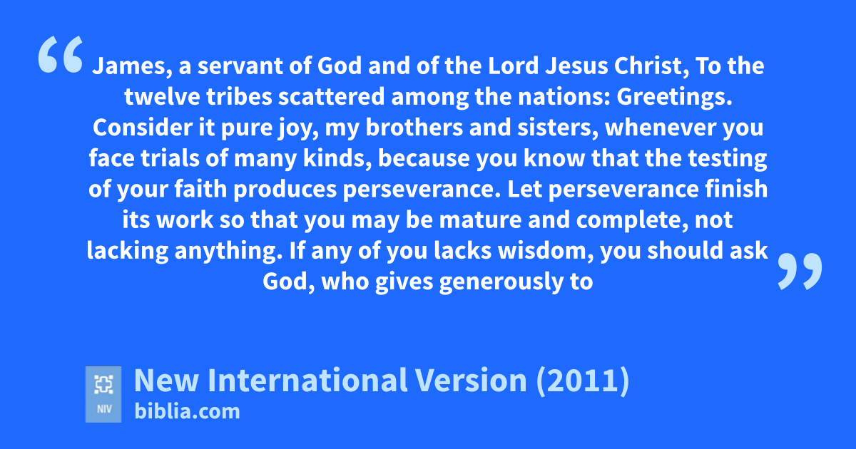 2 Consider it pure joy, my brothers and sisters,a whenever you face trials of many kinds,f 3 because you know that the testing of your faithg produces perseverance.h 4 Let perseverance finish its work so that you may be maturei and complete, not lacking anything. 5 If any of you lacks wisdom, you should ask God,j who gives generously to all without finding fault, and it will be given to you.k 6 But when you ask, you must believe and not doubt,l because the one who doubts is like a wave of the sea, blown and tossed by the wind. 7 That person should not expect to receive anything from the Lord. 8 Such a person is double-mindedm and unstablen in all they do.