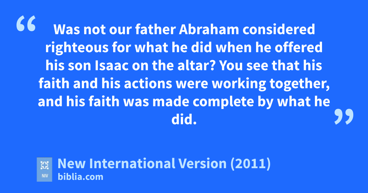 20 You foolish person, do you want evidence that faith without deeds is uselessd?w 21 Was not our father Abraham considered righteous for what he did when he offered his son Isaac on the altar?x 22 You see that his faith and his actions were working together,y and his faith was made complete by what he did.z 23 And the scripture was fulfilled that says, “Abraham believed God, and it was credited to him as righteousness,”e a and he was called God’s friend.b 24 You see that a person is considered righteous by what they do and not by faith alone.