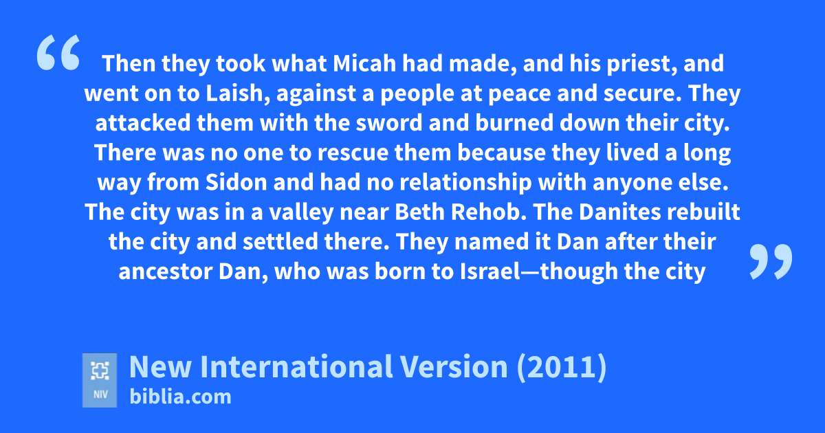 27 Then they took what Micah had made, and his priest, and went on to Laish, against a people at peace and secure.d They attacked them with the sword and burnede down their city.f 28 There was no one to rescue them because they lived a long way from Sidong and had no relationship with anyone else. The city was in a valley near Beth Rehob.h