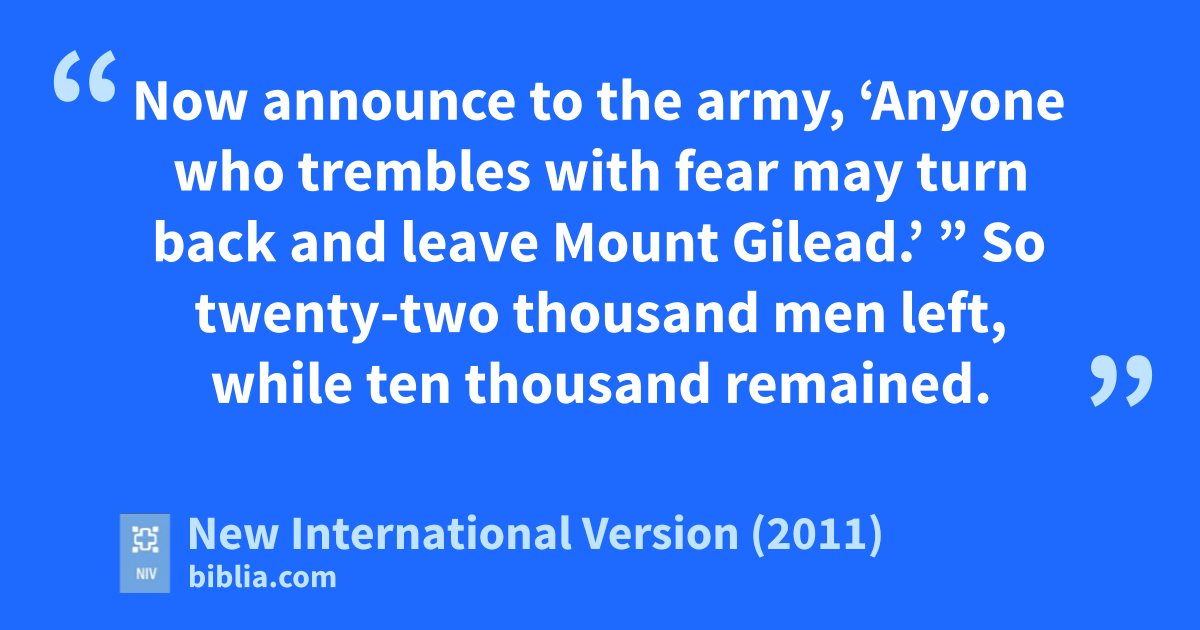7 Early in the morning, Jerub-Baalt (that is, Gideonu) and all his men camped at the spring of Harod.v The camp of Midianw was north of them in the valley near the hill of Moreh.x 2 The Lord said to Gideon, “You have too many men. I cannot deliver Midian into their hands, or Israel would boast against me, ‘My own strengthy has saved me.’ 3 Now announce to the army, ‘Anyone who trembles with fear may turn back and leave Mount Gilead.z’ ” So twenty-two thousand men left, while ten thousand remained.