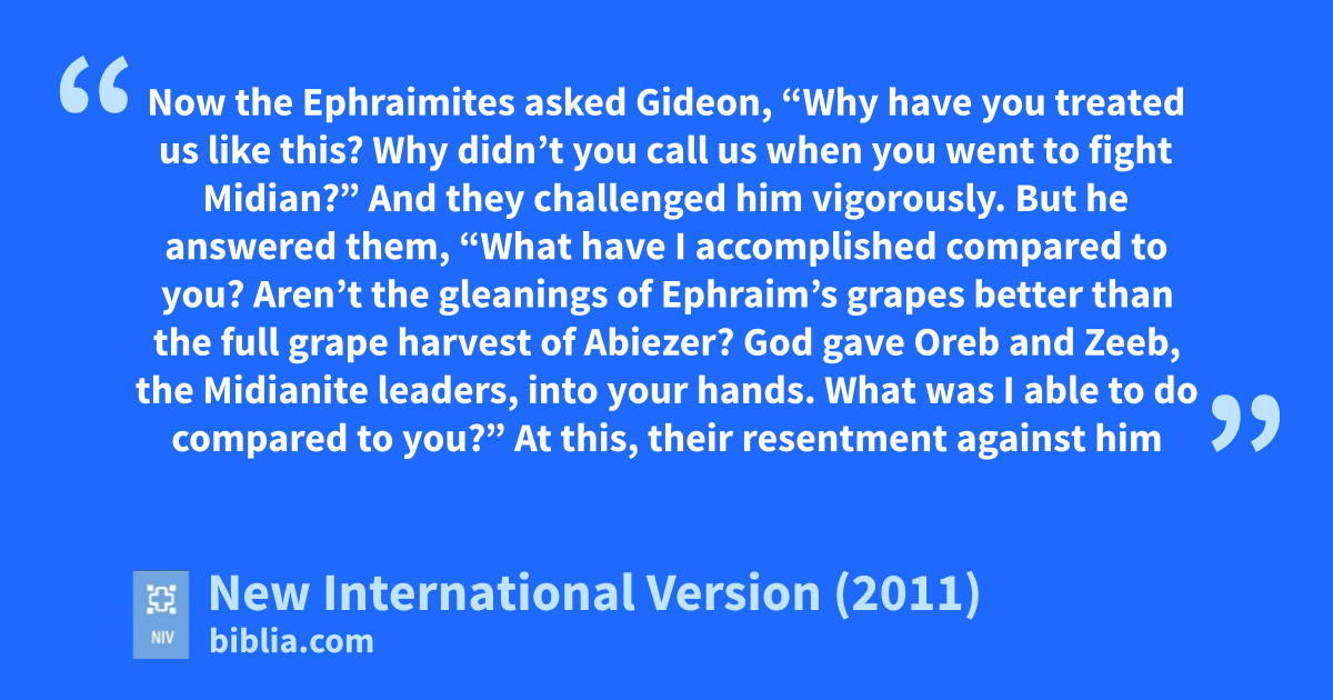 2 But he answered them, “What have I accomplished compared to you? Aren’t the gleanings of Ephraim’s grapes better than the full grape harvest of Abiezer?m 3 God gave Oreb and Zeeb,n the Midianite leaders, into your hands. What was I able to do compared to you?” At this, their resentment against him subsided.