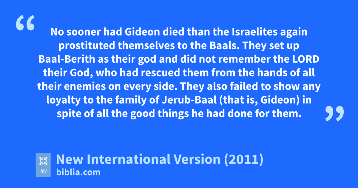 33 No sooner had Gideon died than the Israelites again prostituted themselves to the Baals.d They set up Baal-Berithe as their godf 34 and did not rememberg the Lord their God, who had rescued them from the hands of all their enemies on every side. 35 They also failed to show any loyalty to the family of Jerub-Baalh (that is, Gideon) in spite of all the good things he had done for them.i