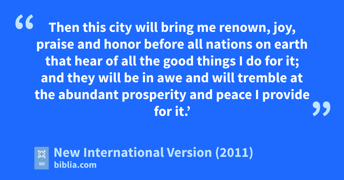 6 “ ‘Nevertheless, I will bring health and healing to it; I will healm my people and will let them enjoy abundant peacen and security. 7 I will bring Judaho and Israel back from captivityb p and will rebuildq them as they were before.r 8 I will cleanses them from all the sin they have committed against me and will forgivet all their sins of rebellion against me. 9 Then this city will bring me renown,u joy, praisev and honorw before all nations on earth that hear of all the good things I do for it; and they will be in awe and will tremblex at the abundant prosperity and peace I provide for it.’