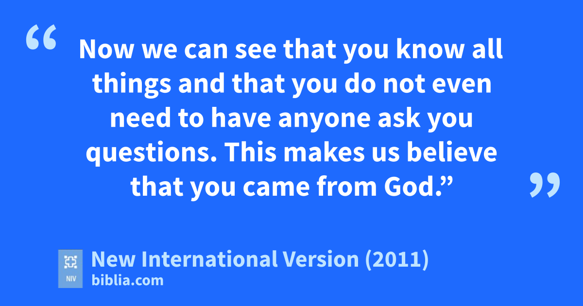 29 Then Jesus’ disciples said, “Now you are speaking clearly and without figures of speech.x 30 Now we can see that you know all things and that you do not even need to have anyone ask you questions. This makes us believey that you came from God.”z