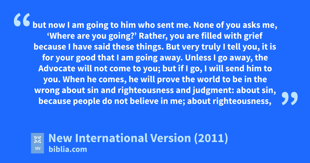 16 “All thisj I have told you so that you will not fall away.k 2 They will put you out of the synagogue;l in fact, the time is coming when anyone who kills you will think they are offering a service to God.m 3 They will do such things because they have not known the Father or me.n 4 I have told you this, so that when their time comes you will remembero that I warned you about them. I did not tell you this from the beginning because I was with you,p 5 but now I am going to him who sent me.q None of you asks me, ‘Where are you going?’r 6 Rather, you are filled with griefs because I have said these things. 7 But very truly I tell you, it is for your good that I am going away. Unless I go away, the Advocatet will not come to you; but if I go, I will send him to you.u 8 When he comes, he will prove the world to be in the wrong about sin and righteousness and judgment: 9 about sin,v because people do not believe in me; 10 about righteousness,w because I am going to the Father,x where you can see me no longer; 11 and about judgment, because the prince of this worldy now stands condemned.