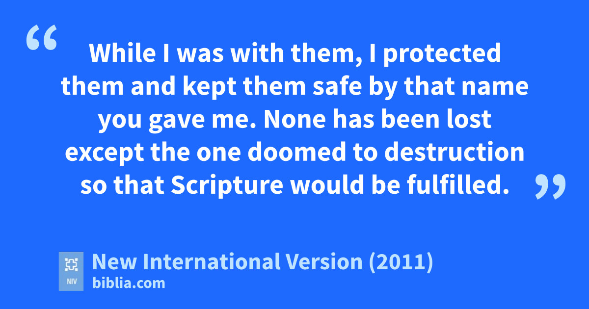 6 “I have revealed youa u to those whom you gave mev out of the world. They were yours; you gave them to me and they have obeyed your word. 7 Now they know that everything you have given me comes from you. 8 For I gave them the words you gave mew and they accepted them. They knew with certainty that I came from you,x and they believed that you sent me.y 9 I pray for them.z I am not praying for the world, but for those you have given me,a for they are yours. 10 All I have is yours, and all you have is mine.b And glory has come to me through them. 11 I will remain in the world no longer, but they are still in the world,c and I am coming to you.d Holy Father, protect them by the power ofb your name, the name you gave me, so that they may be onee as we are one.f 12 While I was with them, I protected them and kept them safe byc that name you gave me. None has been lostg except the one doomed to destructionh so that Scripture would be fulfilled.i