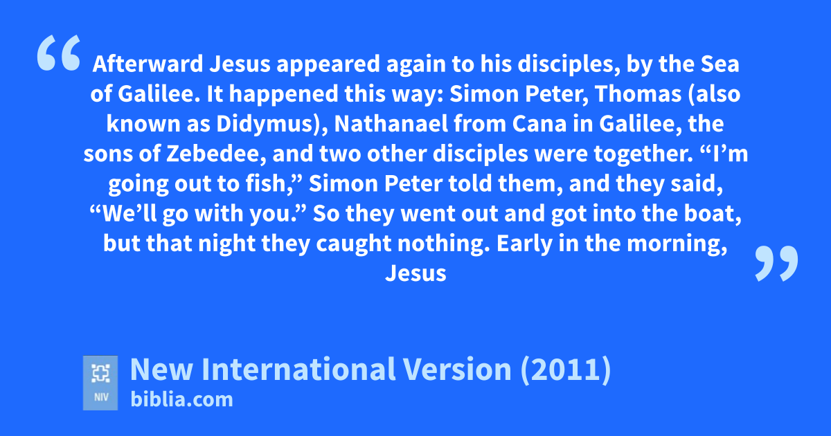 21 Afterward Jesus appeared again to his disciples,a by the Sea of Galilee.a b It happened this way: 2 Simon Peter, Thomasc (also known as Didymusb), Nathanaeld from Cana in Galilee,e the sons of Zebedee,f and two other disciples were together. 3 “I’m going out to fish,” Simon Peter told them, and they said, “We’ll go with you.” So they went out and got into the boat, but that night they caught nothing.g