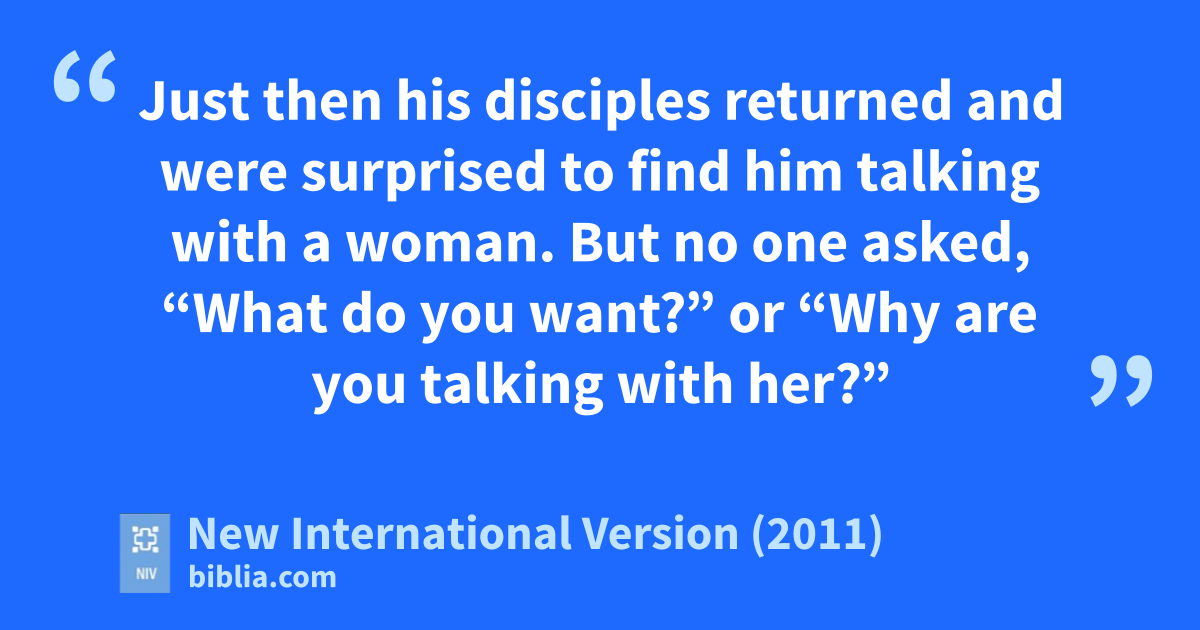 27 Just then his disciples returnedy and were surprised to find him talking with a woman. But no one asked, “What do you want?” or “Why are you talking with her?”
