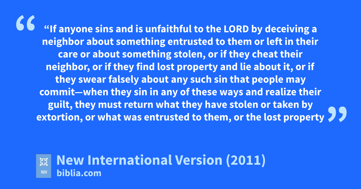 6 a The Lord said to Moses: 2 “If anyone sins and is unfaithful to the Lordt by deceiving a neighboru about something entrusted to them or left in their carev or about something stolen, or if they cheatw their neighbor, 3 or if they find lost property and lie about it,x or if they swear falselyy about any such sin that people may commit—4 when they sin in any of these ways and realize their guilt, they must returnz what they have stolen or taken by extortion, or what was entrusted to them, or the lost property they found, 5 or whatever it was they swore falsely about. They must make restitutiona in full, add a fifth of the value to it and give it all to the owner on the day they present their guilt offering.b 6 And as a penalty they must bring to the priest, that is, to the Lord, their guilt offering,c a ram from the flock, one without defect and of the proper value.d 7 In this way the priest will make atonemente for them before the Lord, and they will be forgiven for any of the things they did that made them guilty.”