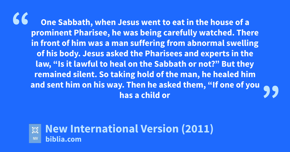 14 One Sabbath, when Jesus went to eat in the house of a prominent Pharisee,z he was being carefully watched.a 2 There in front of him was a man suffering from abnormal swelling of his body. 3 Jesus asked the Pharisees and experts in the law,b “Is it lawful to heal on the Sabbath or not?”c 4 But they remained silent. So taking hold of the man, he healed him and sent him on his way.