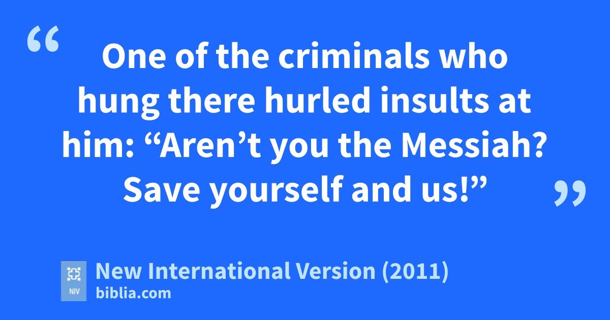 39 One of the criminals who hung there hurled insults at him: “Aren’t you the Messiah? Save yourself and us!”b
