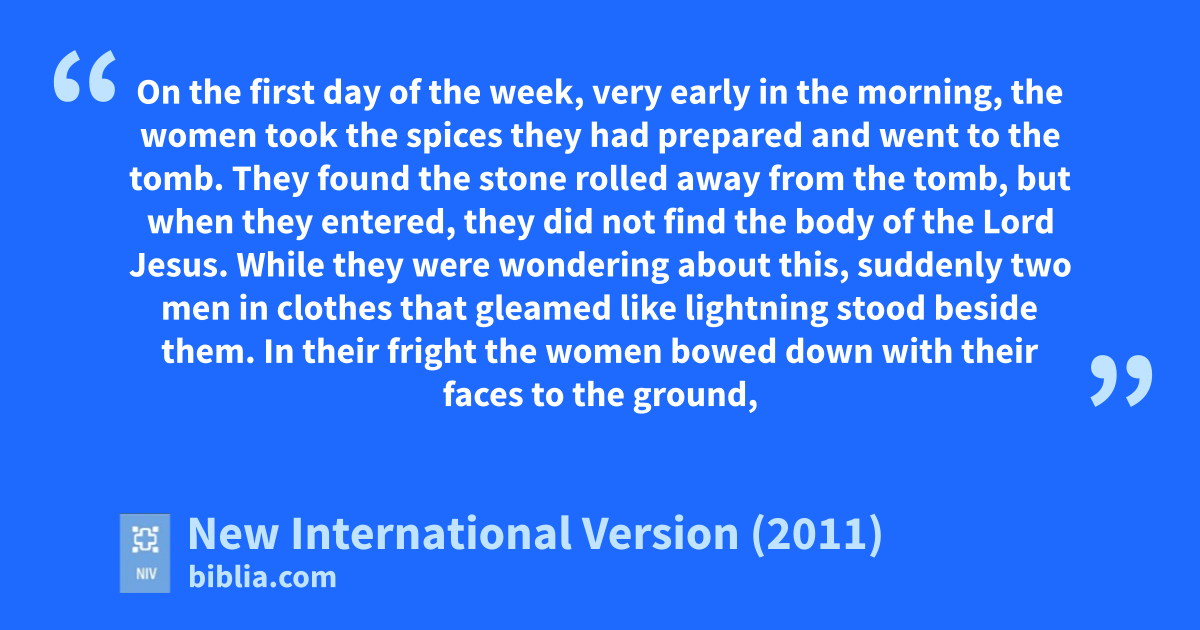 24 On the first day of the week, very early in the morning, the women took the spices they had preparedu and went to the tomb. 2 They found the stone rolled away from the tomb, 3 but when they entered, they did not find the body of the Lord Jesus.v 4 While they were wondering about this, suddenly two men in clothes that gleamed like lightningw stood beside them. 5 In their fright the women bowed down with their faces to the ground, but the men said to them, “Why do you look for the living among the dead? 6 He is not here; he has risen! Remember how he told you, while he was still with you in Galilee:x 7 ‘The Son of Many must be delivered over to the hands of sinners, be crucified and on the third day be raised again.’ ”z 8 Then they remembered his words.a