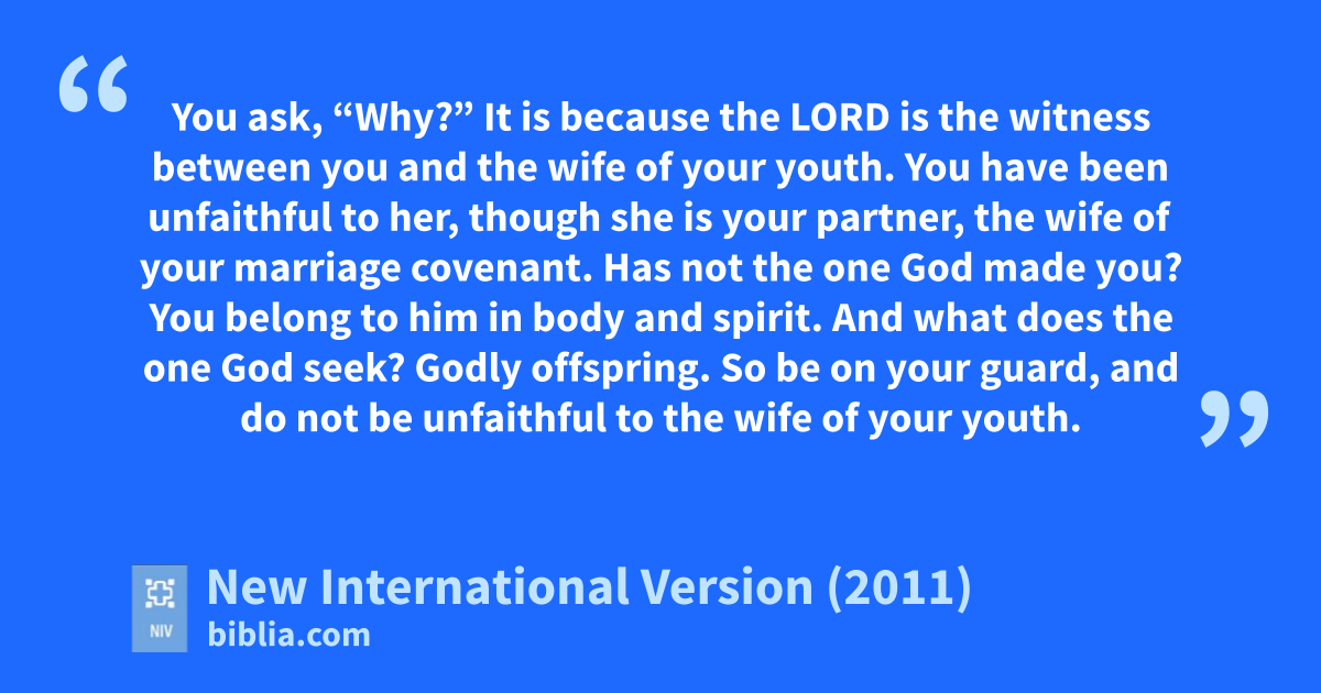 13 Another thing you do: You flood the Lord’s altar with tears.h You weep and waili because he no longer looks with favorj on your offerings or accepts them with pleasure from your hands.k 14 You ask,l “Why?” It is because the Lord is the witnessm between you and the wife of your youth.n You have been unfaithful to her, though she is your partner, the wife of your marriage covenant.o