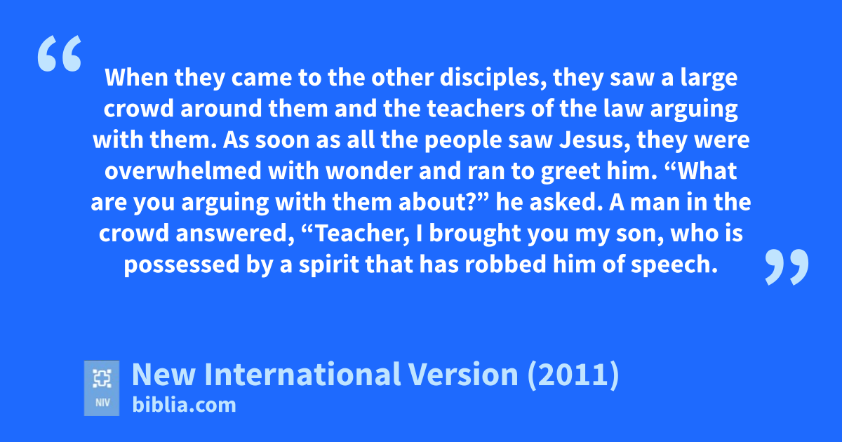14 When they came to the other disciples, they saw a large crowd around them and the teachers of the law arguing with them. 15 As soon as all the people saw Jesus, they were overwhelmed with wonder and ran to greet him.