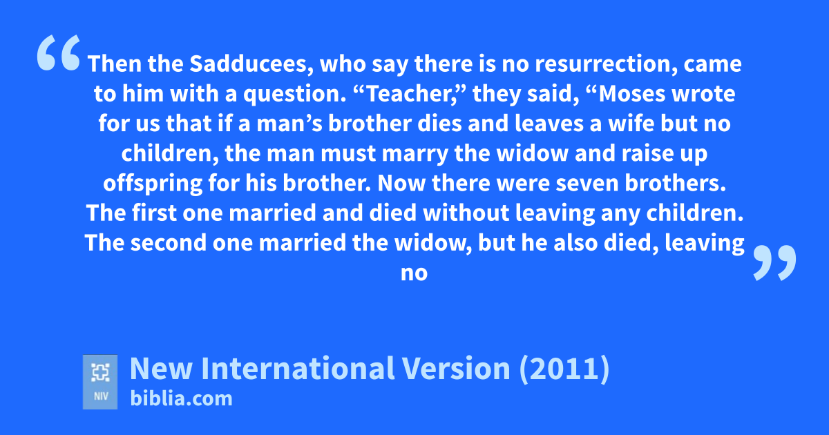 18 Then the Sadducees,f who say there is no resurrection,g came to him with a question. 19 “Teacher,” they said, “Moses wrote for us that if a man’s brother dies and leaves a wife but no children, the man must marry the widow and raise up offspring for his brother.h 20 Now there were seven brothers. The first one married and died without leaving any children. 21 The second one married the widow, but he also died, leaving no child. It was the same with the third. 22 In fact, none of the seven left any children. Last of all, the woman died too. 23 At the resurrectionc whose wife will she be, since the seven were married to her?”