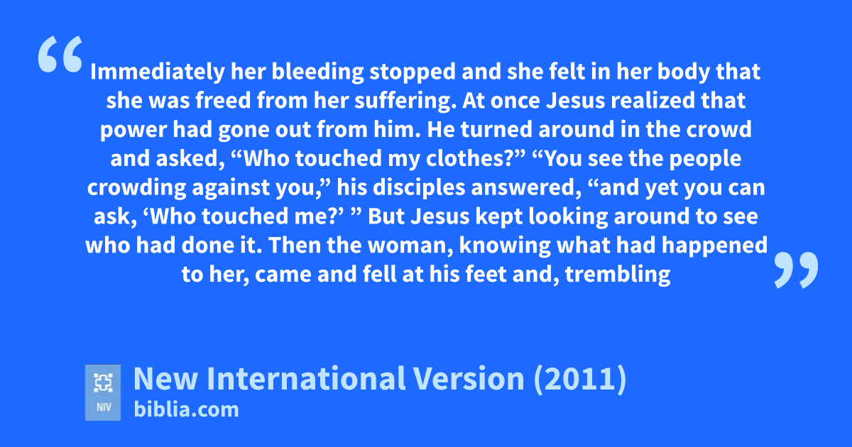 A large crowd followed and pressed around him. 25 And a woman was there who had been subject to bleedingc for twelve years. 26 She had suffered a great deal under the care of many doctors and had spent all she had, yet instead of getting better she grew worse. 27 When she heard about Jesus, she came up behind him in the crowd and touched his cloak, 28 because she thought, “If I just touch his clothes,d I will be healed.” 29 Immediately her bleeding stopped and she felt in her body that she was freed from her suffering.e