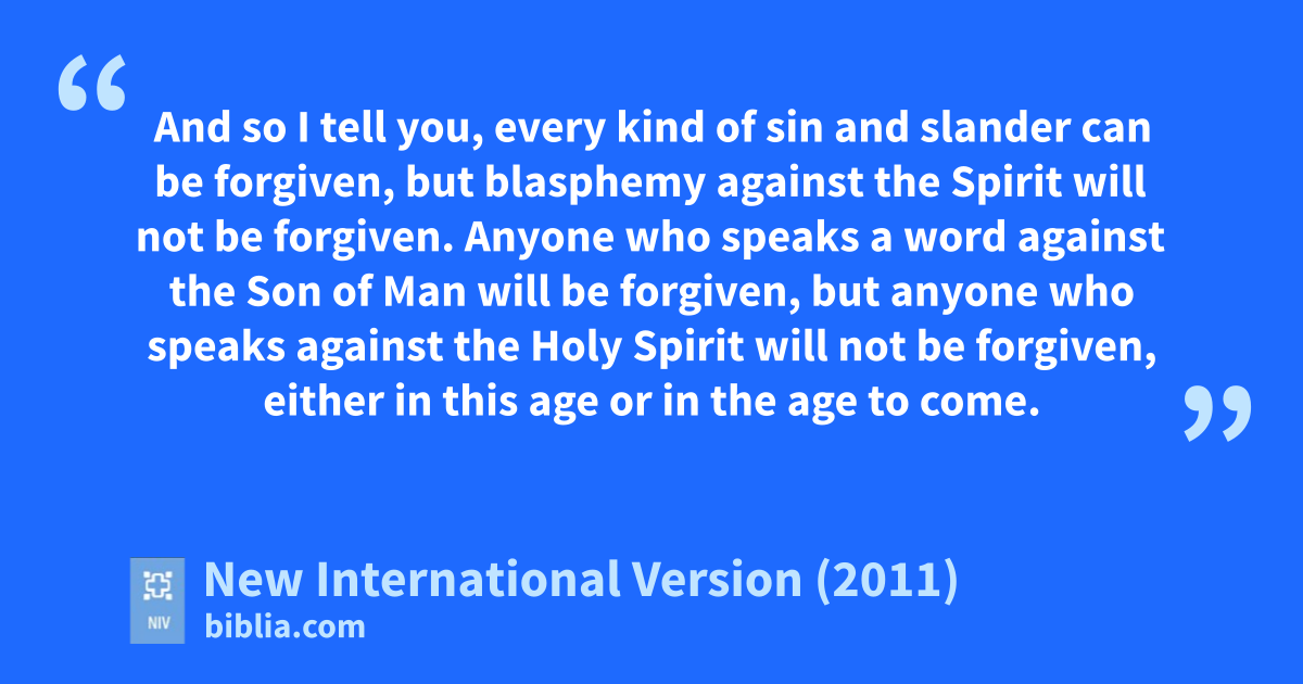 30 “Whoever is not with me is against me, and whoever does not gather with me scatters.z 31 And so I tell you, every kind of sin and slander can be forgiven, but blasphemy against the Spirit will not be forgiven.a 32 Anyone who speaks a word against the Son of Man will be forgiven, but anyone who speaks against the Holy Spirit will not be forgiven, either in this ageb or in the age to come.c