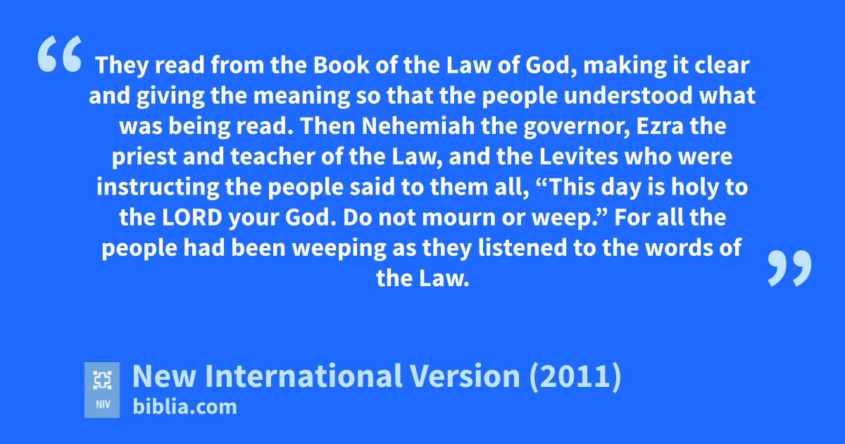 9 Then Nehemiah the governor, Ezra the priest and teacher of the Law, and the Levitesq who were instructing the people said to them all, “This day is holy to the Lord your God. Do not mourn or weep.”r For all the people had been weeping as they listened to the words of the Law.