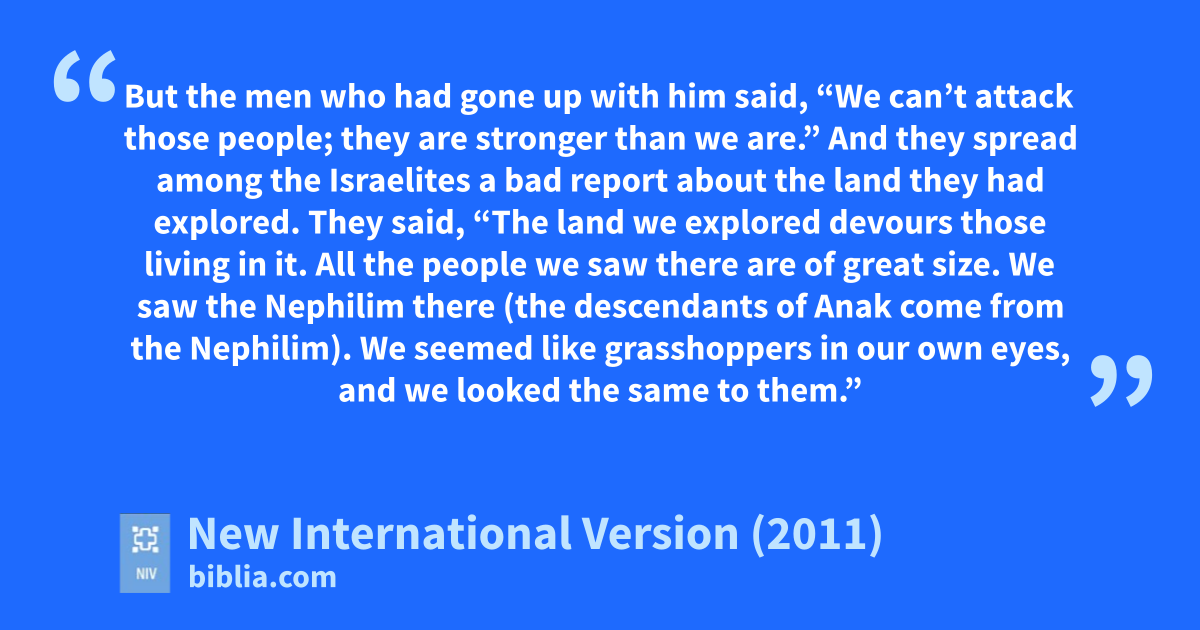 31 But the men who had gone up with him said, “We can’t attack those people; they are stronger than we are.”w 32 And they spread among the Israelites a bad reportx about the land they had explored. They said, “The land we explored devoursy those living in it. All the people we saw there are of great size.z 33 We saw the Nephilima there (the descendants of Anakb come from the Nephilim). We seemed like grasshoppersc in our own eyes, and we looked the same to them.”