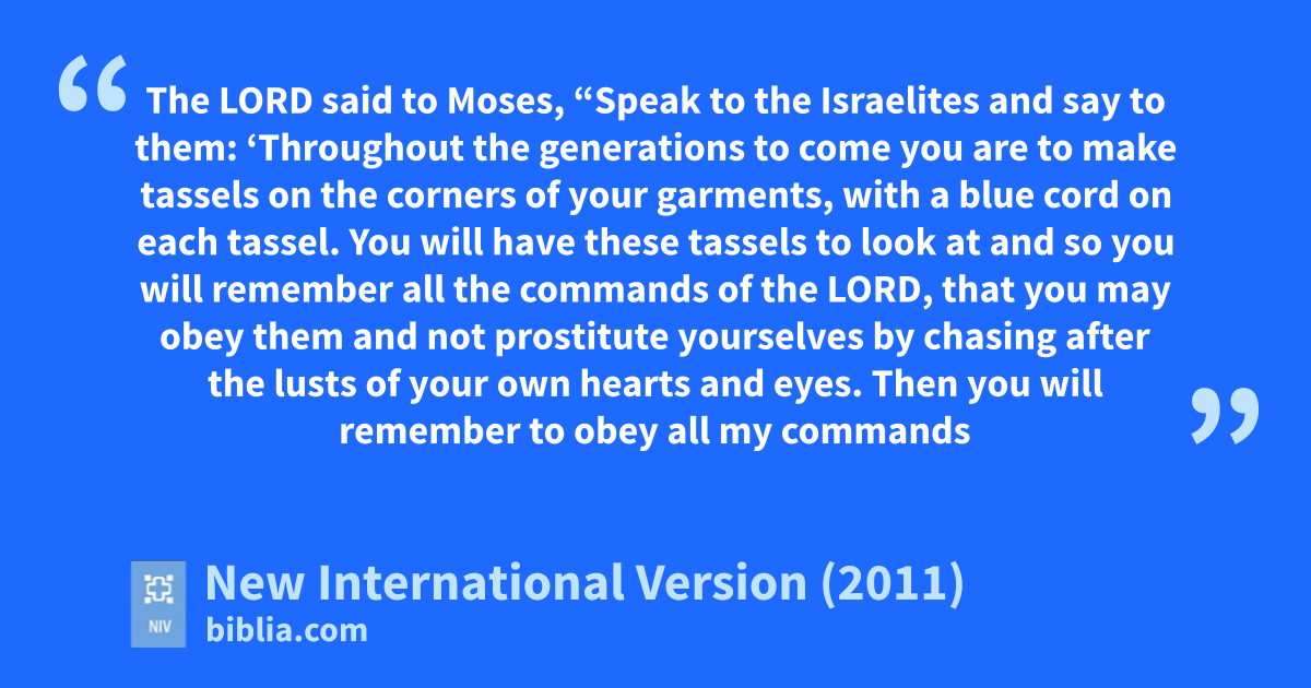37 The Lord said to Moses, 38 “Speak to the Israelites and say to them: ‘Throughout the generations to comev you are to make tassels on the corners of your garments,w with a blue cord on each tassel. 39 You will have these tassels to look at and so you will rememberx all the commands of the Lord, that you may obey them and not prostitute yourselvesy by chasing after the lusts of your own heartsz and eyes. 40 Then you will remember to obey all my commandsa and will be consecrated to your God.b 41 I am the Lord your God, who brought you out of Egypt to be your God.c I am the Lord your God.d’ ”