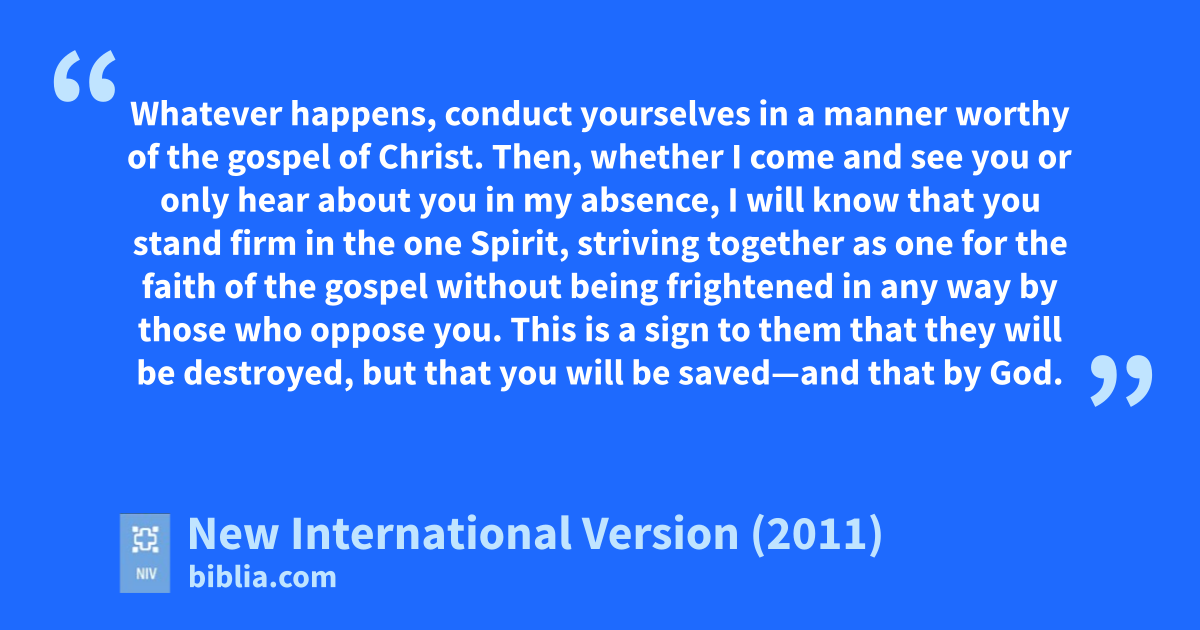 27 Whatever happens, conduct yourselves in a manner worthyl of the gospel of Christ. Then, whether I come and see you or only hear about you in my absence, I will know that you stand firmm in the one Spirit,e striving togethern as one for the faith of the gospel 28 without being frightened in any way by those who oppose you. This is a sign to them that they will be destroyed, but that you will be saved—and that by God. 29 For it has been granted to youo on behalf of Christ not only to believe in him, but also to sufferp for him, 30 since you are going through the same struggleq you sawr I had, and now hears that I still have.
