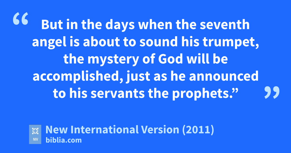 5 Then the angel I had seen standing on the sea and on the landd raised his right hand to heaven.e 6 And he sworef by him who lives for ever and ever,g who created the heavens and all that is in them, the earth and all that is in it, and the sea and all that is in it,h and said, “There will be no more delay!i 7 But in the days when the seventh angel is about to sound his trumpet,j the mysteryk of God will be accomplished, just as he announced to his servants the prophets.”l