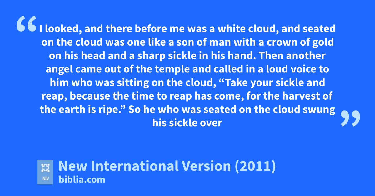 14 I looked, and there before me was a white cloud,o and seated on the cloud was one like a son of manb p with a crownq of gold on his head and a sharp sickle in his hand. 15 Then another angel came out of the templer and called in a loud voice to him who was sitting on the cloud, “Take your sickles and reap, because the time to reap has come, for the harvestt of the earth is ripe.” 16 So he who was seated on the cloud swung his sickle over the earth, and the earth was harvested.