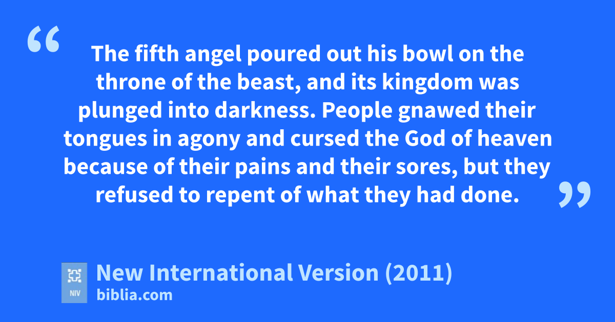 10 The fifth angel poured out his bowl on the throne of the beast,d and its kingdom was plunged into darkness.e People gnawed their tongues in agony 11 and cursedf the God of heaveng because of their pains and their sores,h but they refused to repent of what they had done.i