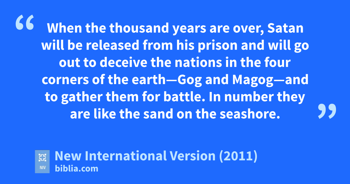 7 When the thousand years are over,j Satan will be released from his prison 8 and will go out to deceive the nationsk in the four corners of the earthl—Gog and Magogm—and to gather them for battle.n In number they are like the sand on the seashore.o 9 They marched across the breadth of the earth and surroundedp the camp of God’s people, the city he loves.q But fire came down from heavenr and devoured them. 10 And the devil, who deceived them,s was thrown into the lake of burning sulfur,t where the beastu and the false prophetv had been thrown. They will be tormented day and night for ever and ever.w