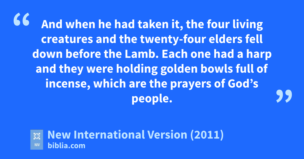 6 Then I saw a Lamb,v looking as if it had been slain, standing at the center of the throne, encircled by the four living creaturesw and the elders.x The Lamb had seven horns and seven eyes,y which are the seven spiritsa z of God sent out into all the earth. 7 He went and took the scroll from the right hand of him who sat on the throne.a 8 And when he had taken it, the four living creaturesb and the twenty-four eldersc fell down before the Lamb. Each one had a harpd and they were holding golden bowls full of incense, which are the prayerse of God’s people. 9 And they sang a new song, saying:f