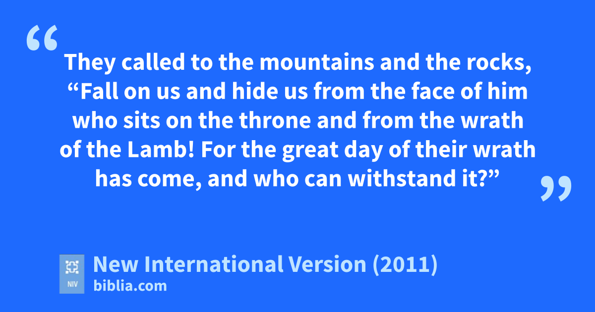 15 Then the kings of the earth, the princes, the generals, the rich, the mighty, and everyone else, both slave and free,l hid in caves and among the rocks of the mountains.m 16 They called to the mountains and the rocks, “Fall on usn and hide usf from the face of him who sits on the throneo and from the wrath of the Lamb! 17 For the great dayp of theirg wrath has come, and who can withstand it?”q