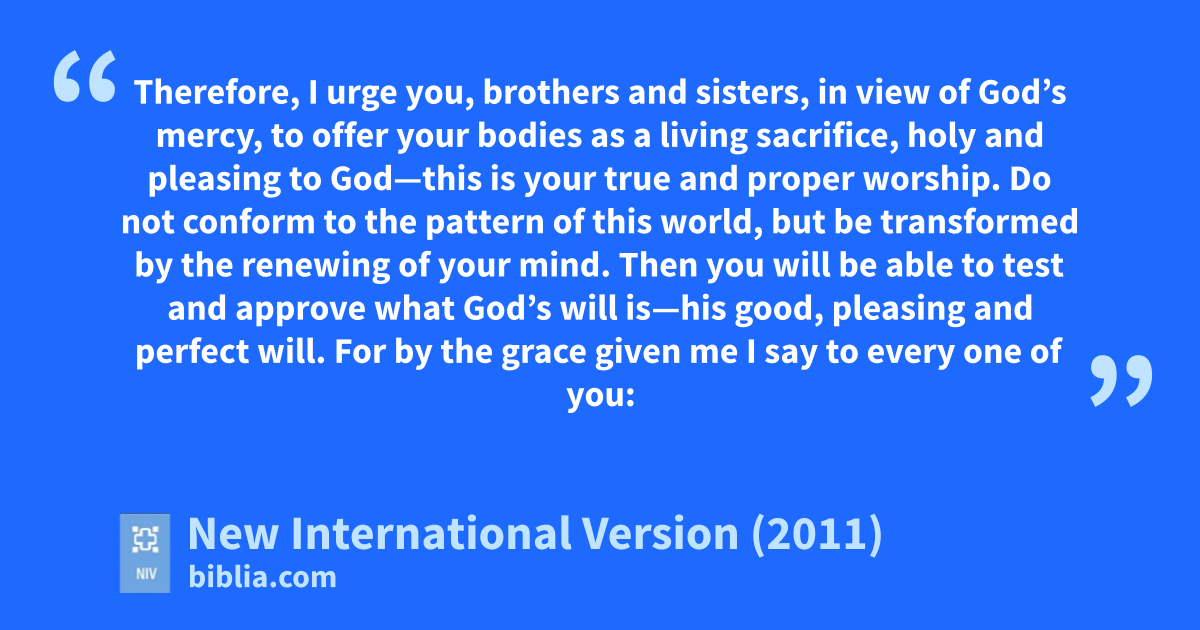 12 Therefore, I urge you,f brothers and sisters, in view of God’s mercy, to offer your bodies as a living sacrifice,g holy and pleasing to God—this is your true and proper worship. 2 Do not conformh to the pattern of this world,i but be transformed by the renewing of your mind.j Then you will be able to test and approve what God’s will isk—his good, pleasingl and perfect will.
