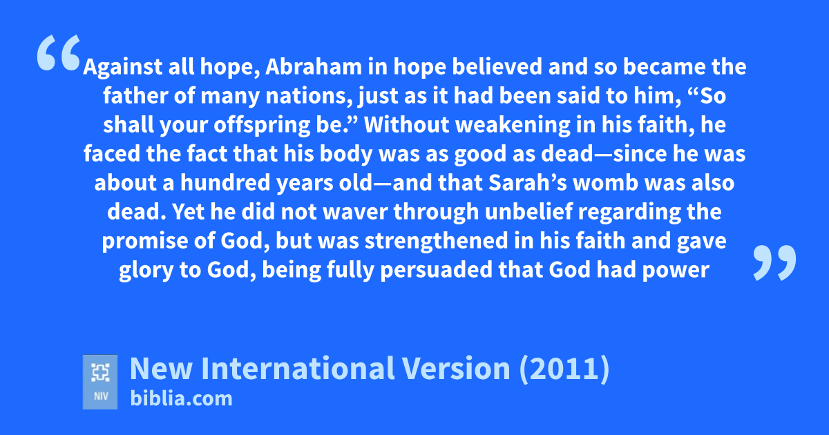 18 Against all hope, Abraham in hope believed and so became the father of many nations,s just as it had been said to him, “So shall your offspring be.”d t 19 Without weakening in his faith, he faced the fact that his body was as good as deadu—since he was about a hundred years oldv—and that Sarah’s womb was also dead.w 20 Yet he did not waver through unbelief regarding the promise of God, but was strengthenedx in his faith and gave glory to God,y 21 being fully persuaded that God had power to do what he had promised.z 22 This is why “it was credited to him as righteousness.”a 23 The words “it was credited to him” were written not for him alone, 24 but also for us,b to whom God will credit righteousness—for us who believe in himc who raised Jesus our Lord from the dead.d 25 He was delivered over to death for our sinse and was raised to life for our justification.f