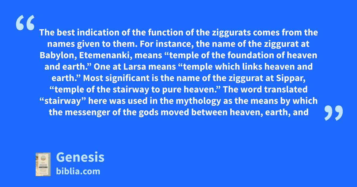 The best indication of the function of the ziggurats comes from the names given to them. For instance, the name of the ziggurat at Babylon, Etemenanki, means “temple of the foundation of heaven and earth.” One at Larsa means “temple which links heaven and earth.” Most significant is the name of the ziggurat at Sippar, “temple of the stairway to pure heaven.” The word translated “stairway” here was used in the mythology as the means by which the messenger of the gods moved between heaven, earth, and