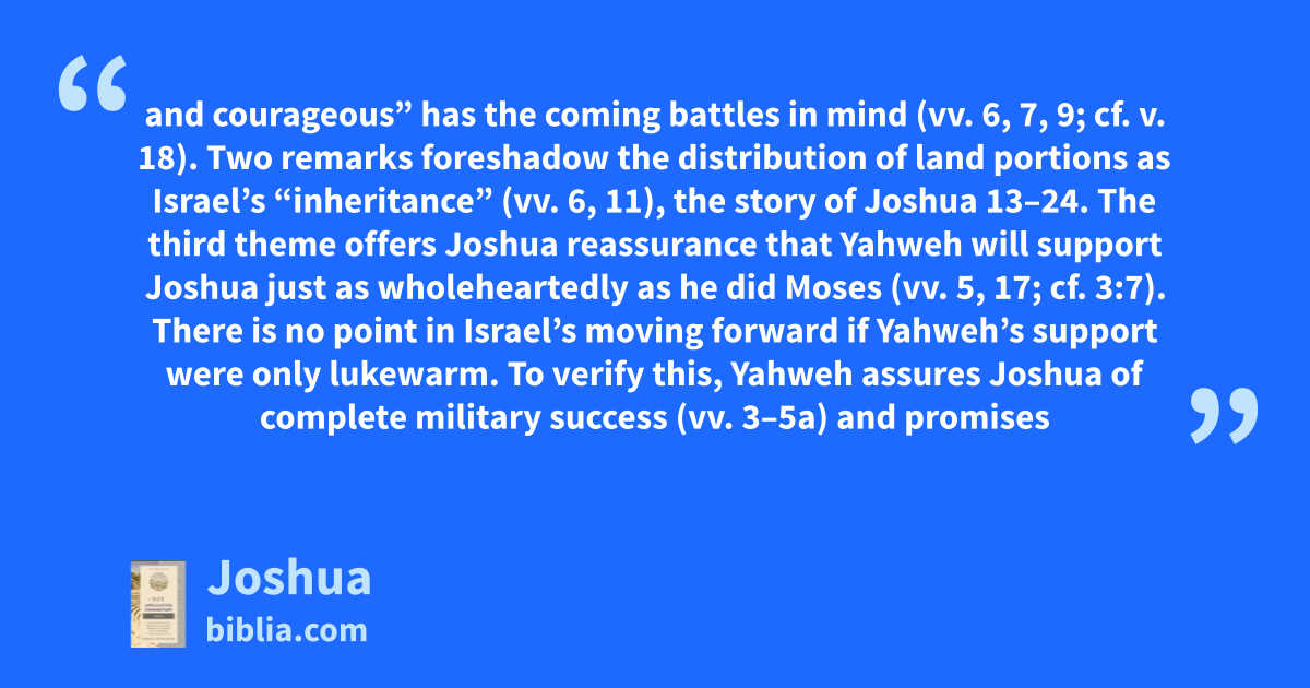 and courageous” has the coming battles in mind (vv. 6, 7, 9; cf. v. 18). Two remarks foreshadow the distribution of land portions as Israel’s “inheritance” (vv. 6, 11), the story of Joshua 13–24. The third theme offers Joshua reassurance that Yahweh will support Joshua just as wholeheartedly as he did Moses (vv. 5, 17; cf. 3:7). There is no point in Israel’s moving forward if Yahweh’s support were only lukewarm. To verify this, Yahweh assures Joshua of complete military success (vv. 3–5a) and promises