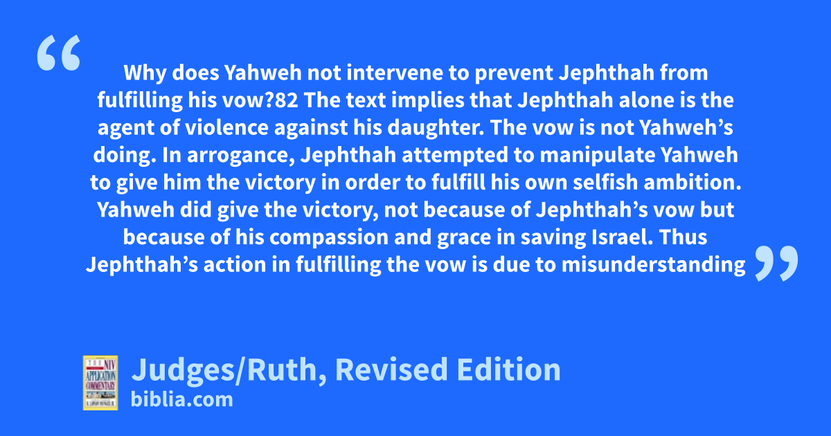 Why does Yahweh not intervene to prevent Jephthah from fulfilling his vow?82 The text implies that Jephthah alone is the agent of violence against his daughter. The vow is not Yahweh’s doing. In arrogance, Jephthah attempted to manipulate Yahweh to give him the victory in order to fulfill his own selfish ambition. Yahweh did give the victory, not because of Jephthah’s vow but because of his compassion and grace in saving Israel. Thus Jephthah’s action in fulfilling the vow is due to misunderstanding