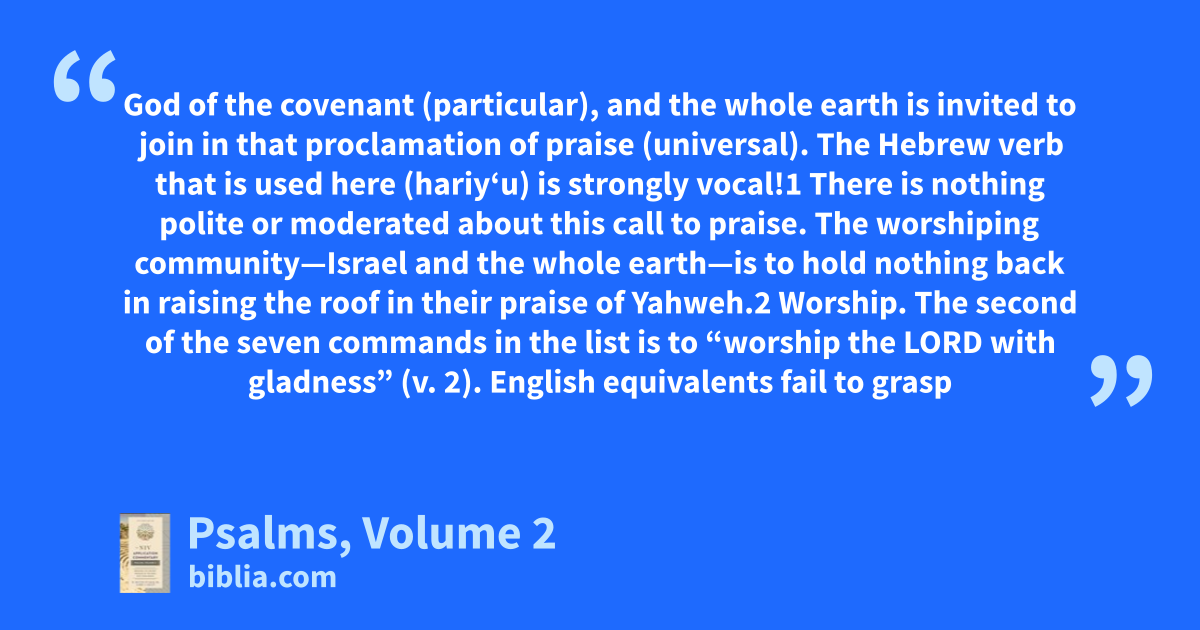 God of the covenant (particular), and the whole earth is invited to join in that proclamation of praise (universal). The Hebrew verb that is used here (hariy‘u) is strongly vocal!1 There is nothing polite or moderated about this call to praise. The worshiping community—Israel and the whole earth—is to hold nothing back in raising the roof in their praise of Yahweh.2 Worship. The second of the seven commands in the list is to “worship the LORD with gladness” (v. 2). English equivalents fail to grasp