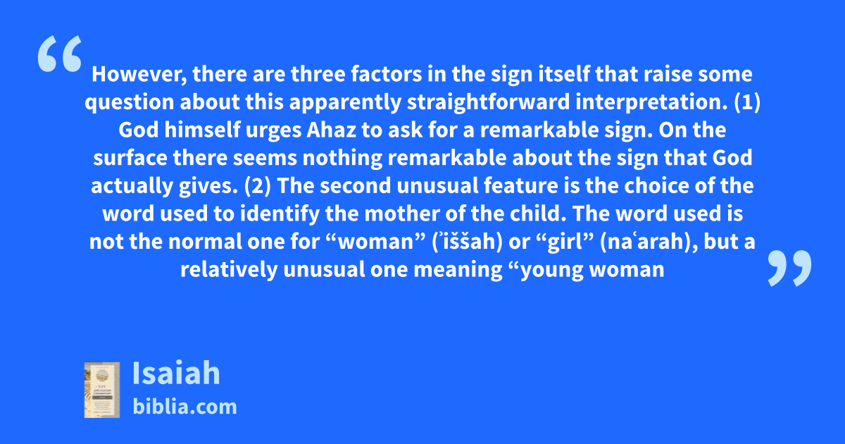 However, there are three factors in the sign itself that raise some question about this apparently straightforward interpretation. (1) God himself urges Ahaz to ask for a remarkable sign. On the surface there seems nothing remarkable about the sign that God actually gives. (2) The second unusual feature is the choice of the word used to identify the mother of the child. The word used is not the normal one for “woman” (ʾiššah) or “girl” (naʿarah), but a relatively unusual one meaning “young woman